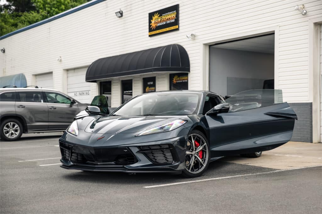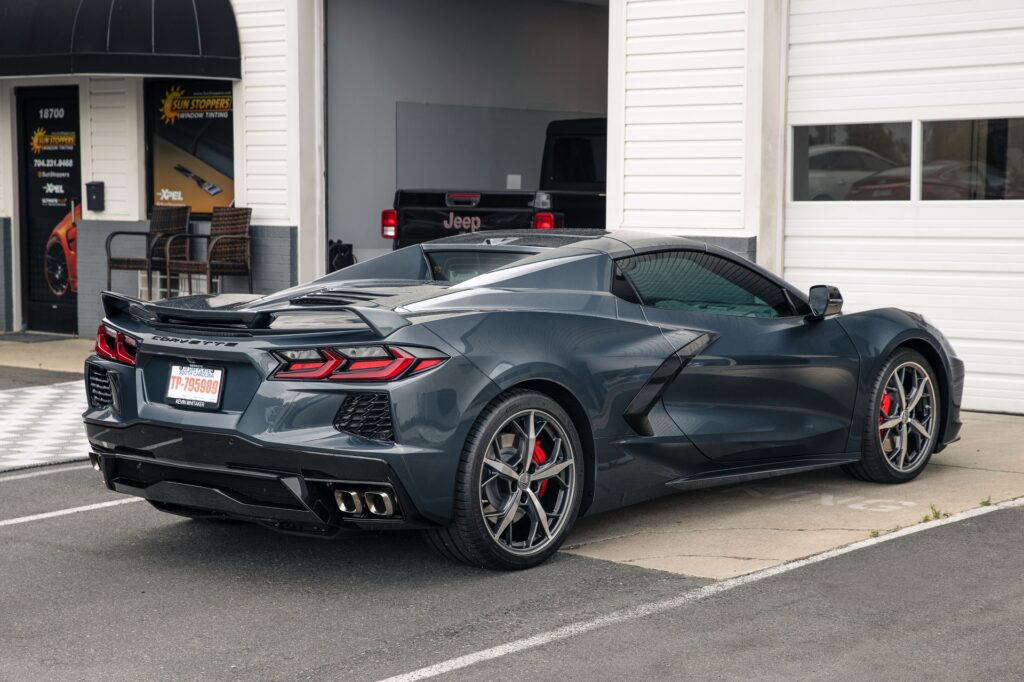 Take a look at this beautiful window tint job on this 2021 Chevrolet C8 Corvette! When you are looking to keep your Corvette cooler, more private, and reduce sun glare in your eyes while driving – then you need Chevrolet C8 Corvette window tinting services from Sun Stoppers!