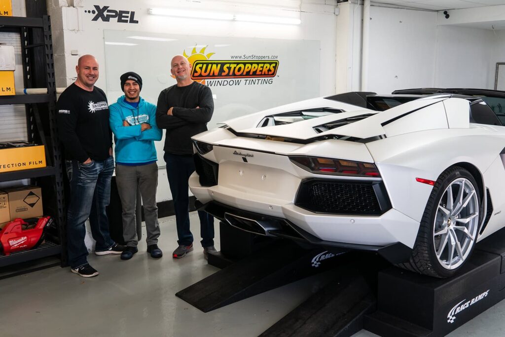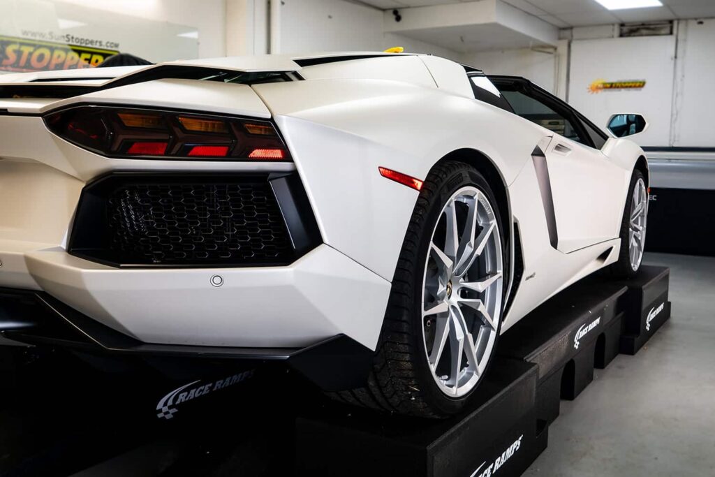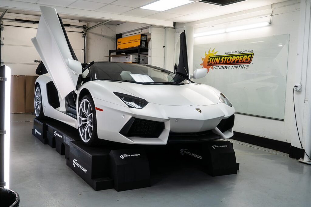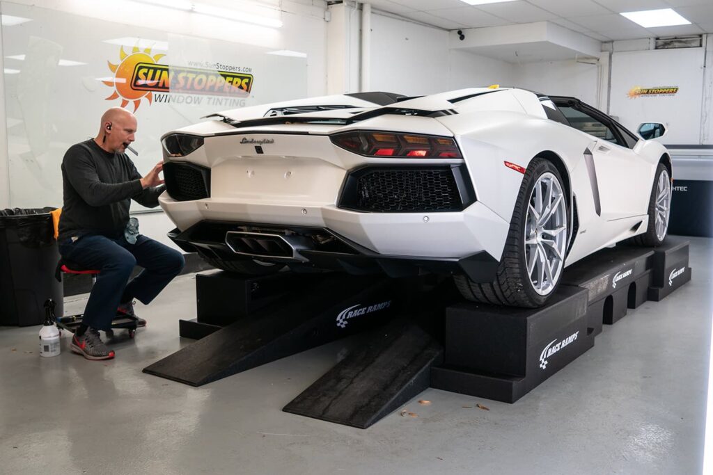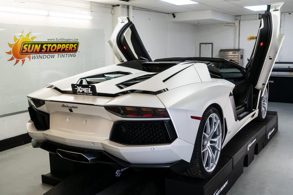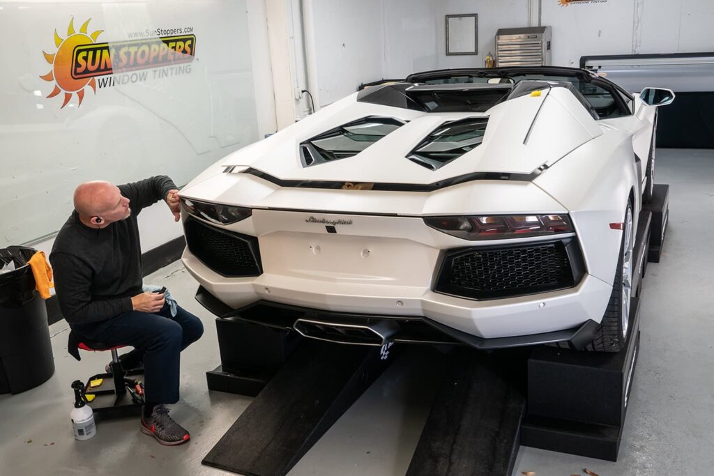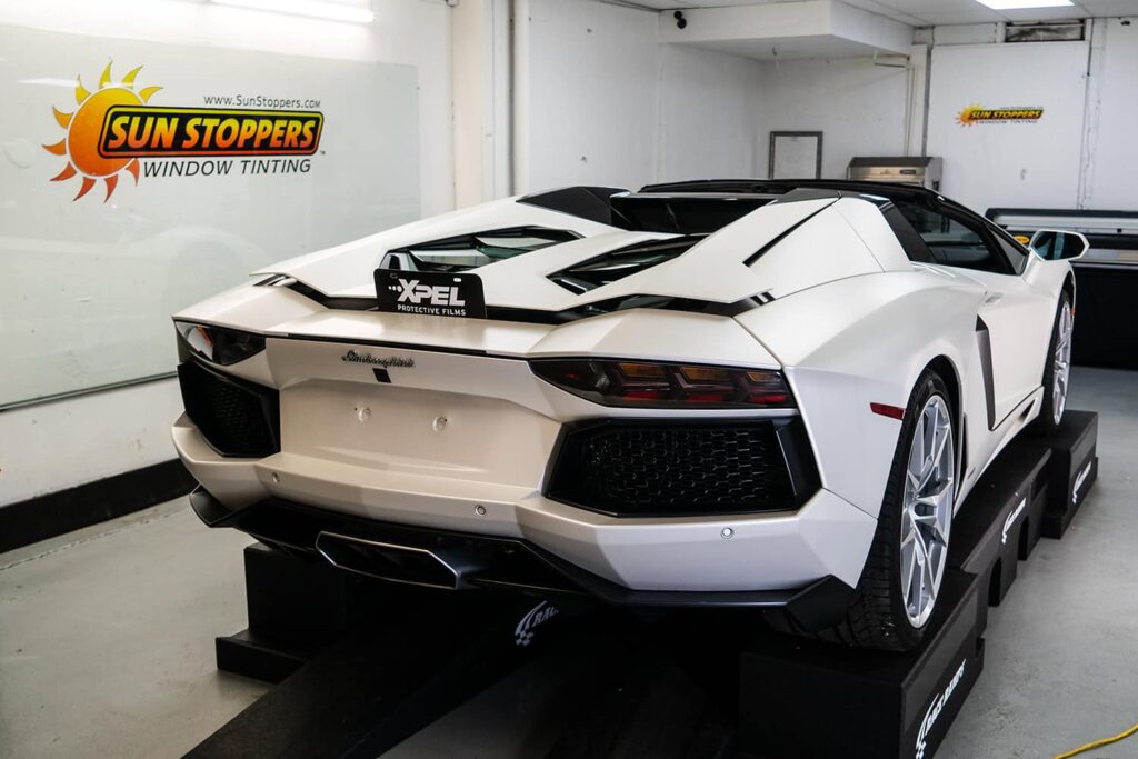 Take a look at this beautiful window tint job on this Lamborghini Aventador S Roadster! When you are looking to keep your Lamborghini more private, and reduce sun glare in your eyes while driving – then you need Lamborghini Aventador S Roadster window tinting services from Sun Stoppers!