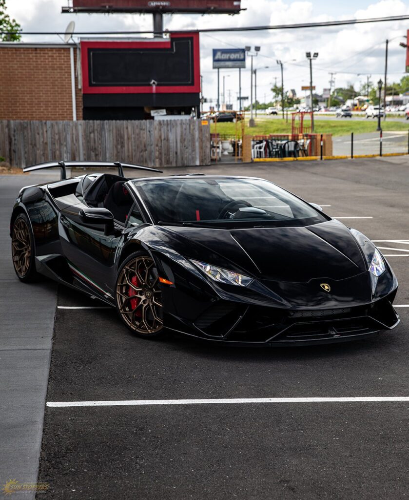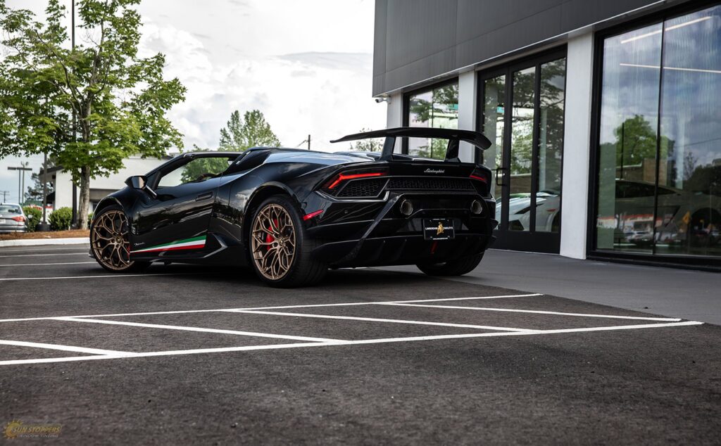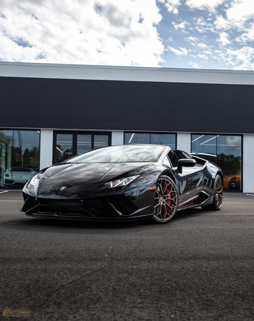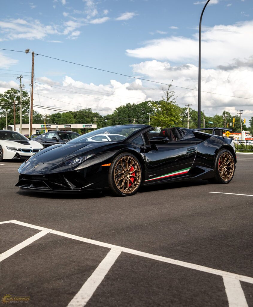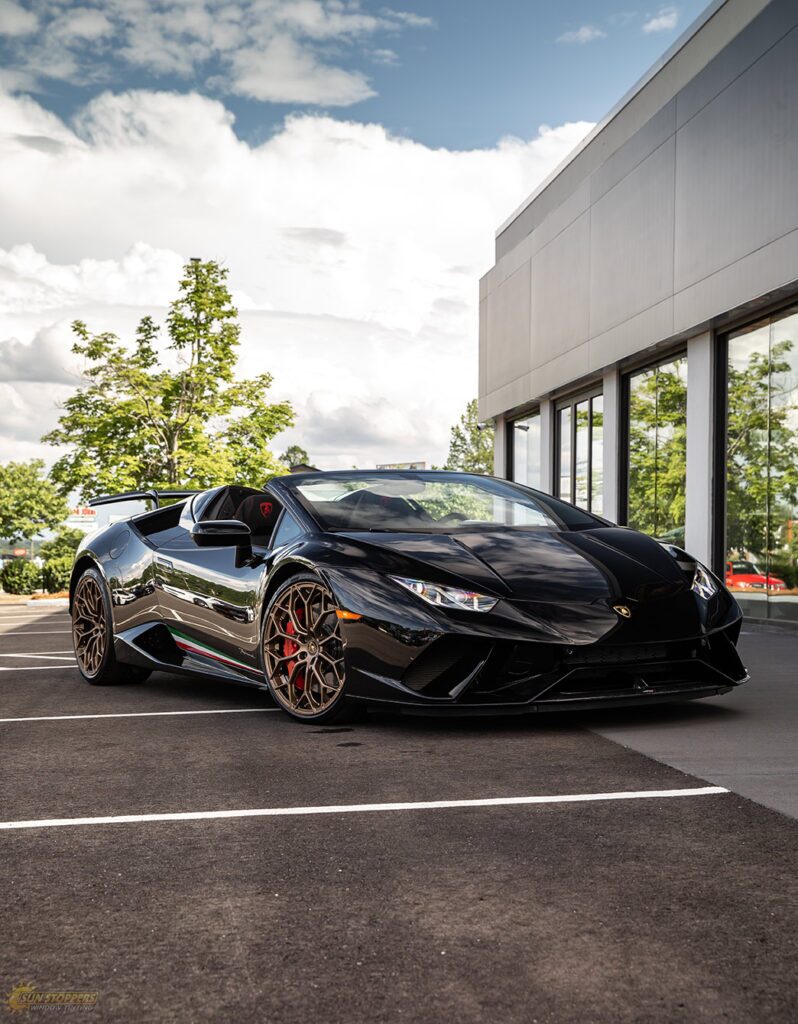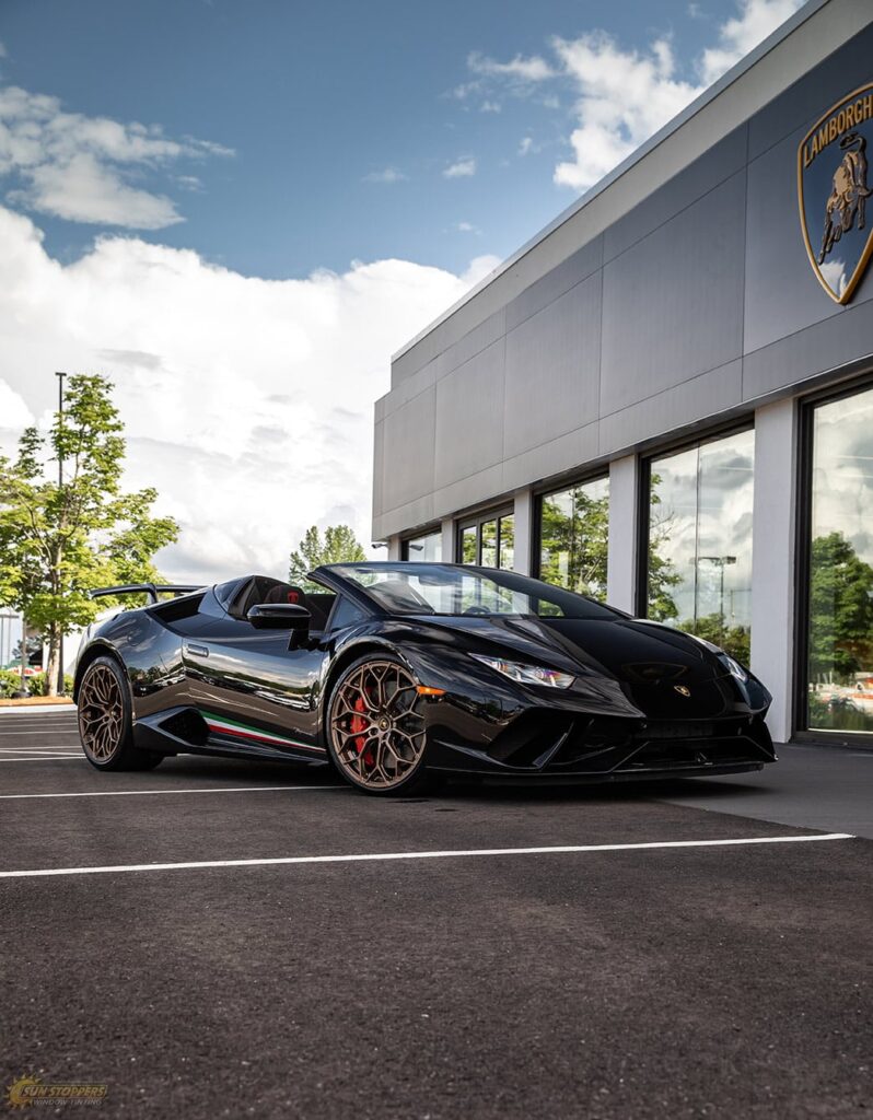 Take a look at this beautiful window tint job on this Lamborghini Perfomante! When you are looking to keep your Lamborghini more private, and reduce sun glare in your eyes while driving – then you need Lamborghini Performante window tinting services from Sun Stoppers!